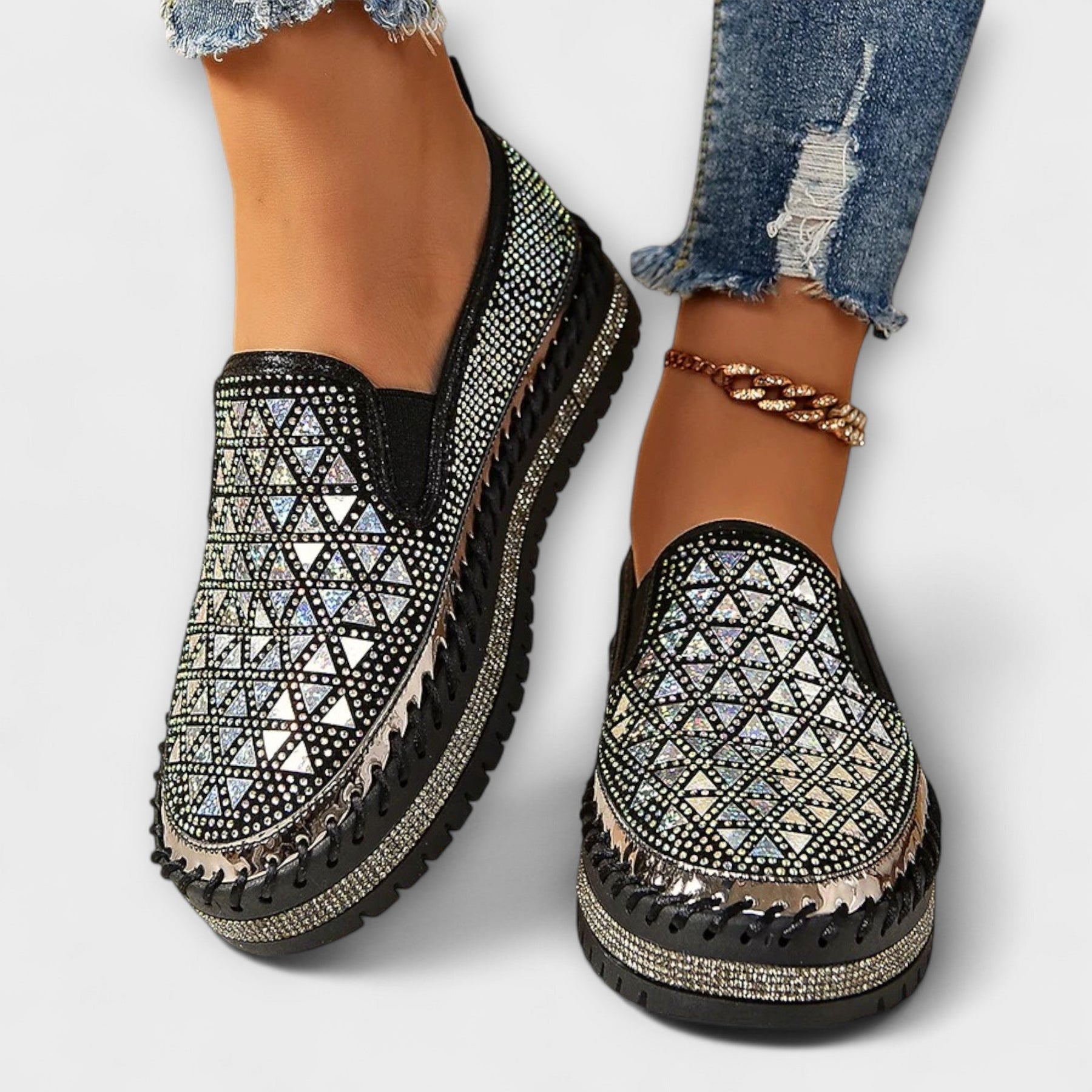 Vada kombinerar vardagskomfort med en exklusiv, glittrande finish. De geometriska mönstren med glänsande detaljer ger en modern och iögonfallande prägel, perfekt för dig som vill ha både stil och komfort i ett. Den flexibla sulan gör dem idealiska för långvarig användning, oavsett om du ska ut på stan eller njuta av en avslappnad dag.